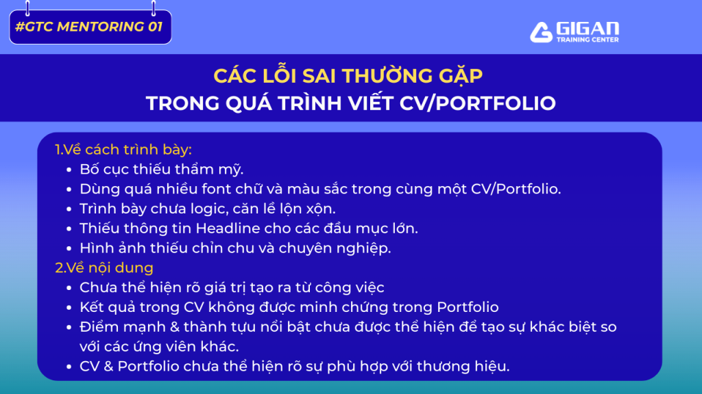 Bên cạnh đó, việc trình bày nội dung chưa logic, thiếu sự chỉn chu cho các đầu mục chính cũng là điểm trừ lớn. Cuối cùng, đừng quên đầu tư vào hình ảnh cá nhân để CV/Portfolio của bạn trông chuyên nghiệp hơn.