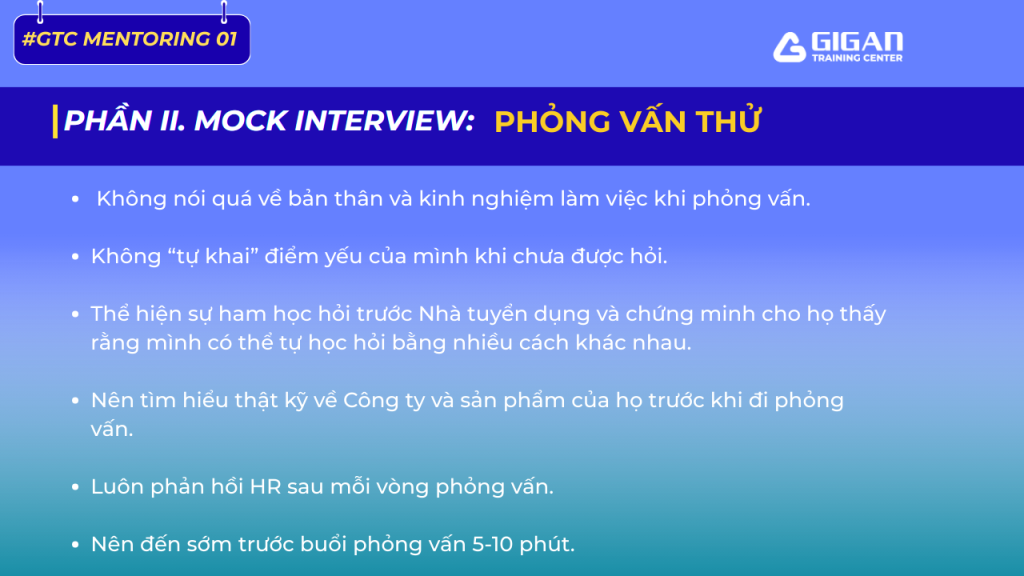 Chương trình GTC Mentoring 01: CV Check & Mock Interview đã khép lại, nhưng các Key note cùng những góc nhìn thực tế trong chương trình ắt hẳn sẽ giúp các bạn trẻ có cái nhìn rõ ràng hơn về câu chuyện đi tìm bến đỗ đúng đắn cho sự nghiệp.